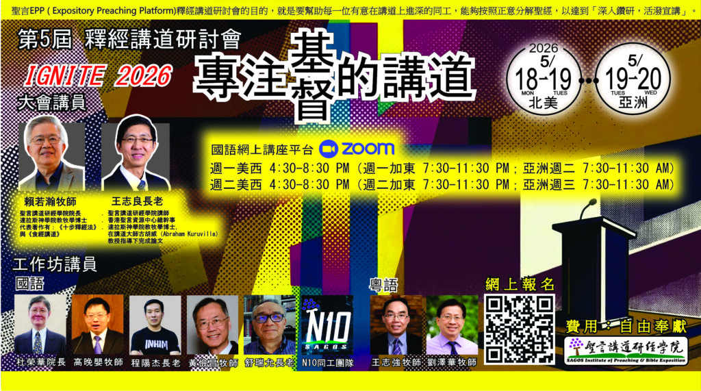 由「美國聖言」主辦的「第5屆釋經講道進深研討會」,將於5月18日至19日(週一至週二)下午4:30-8:30(美西時間)舉行。主題為「專注基督的講道」。主題講員為賴若瀚牧師和王志良長老。研討會的專題講員包括杜榮華長老, 程陽杰長老, 黃儉昌牧師, 高晚嬰牧師, 舒瑞允長老及N10同工團隊, 劉澤華牧師及王志強牧師。詳情請參見附上的海報。